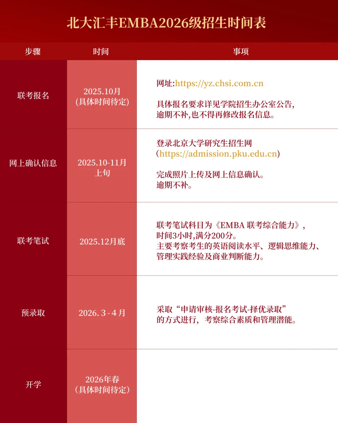 2026级北大汇丰EMBA提前面试共5个面试批次,第一批提前面试申请截止时间为2025年3月4日,想要申请北大汇丰EMBA的同学,尽量提前准备抢占先机!