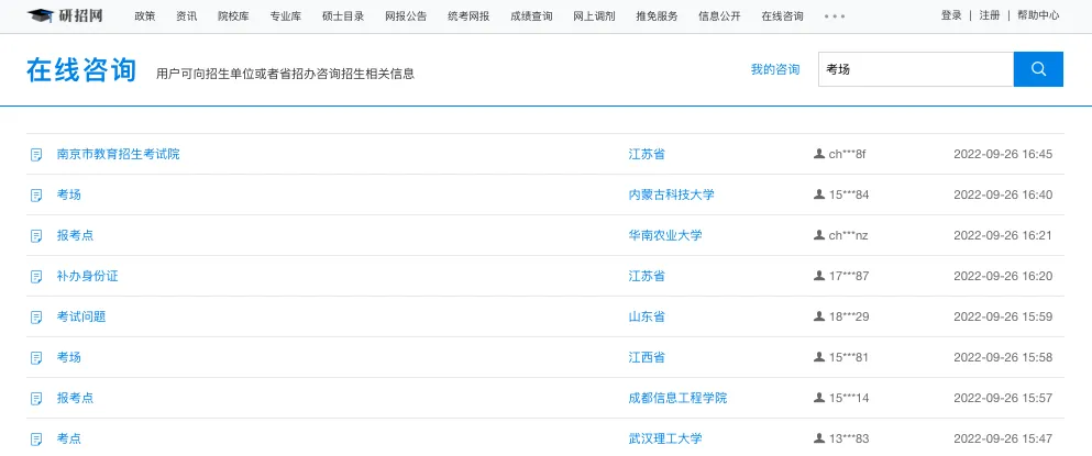 网上咨询周期间各院校在研招网回复了考生的问题,其中有不少是和考场相关的,所以大家可以登录研招网,在「在线咨询」中搜索“考场”,可以找到部分考点信息。