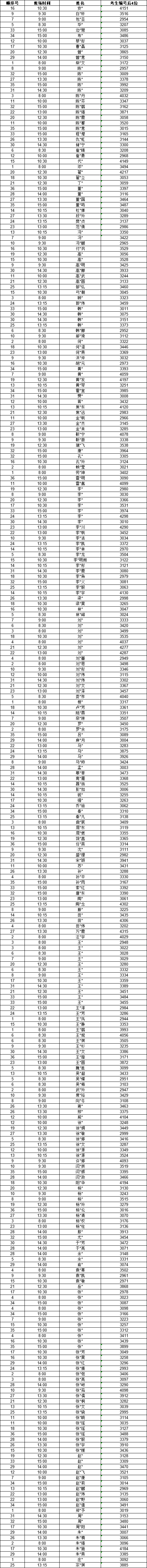 各考场顺序号原则上不予调整,如遇极特殊情况需变更,可在现场向签到老师提出申请